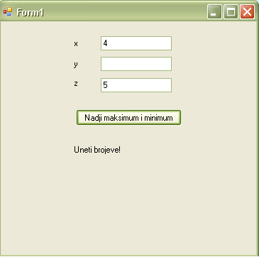 label4.Text = "Maksimum tri uneta broja je " + max + ", a minimum je " + min;