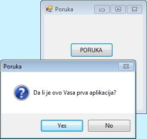 Пример 2. Написати програм који притиском на дугме PORUKA исписује питање Da li je ovo Vasa prva aplikacija? у MessageBox-у. MessageBox треба да има два дугмета Yes и No, име и иконицу.