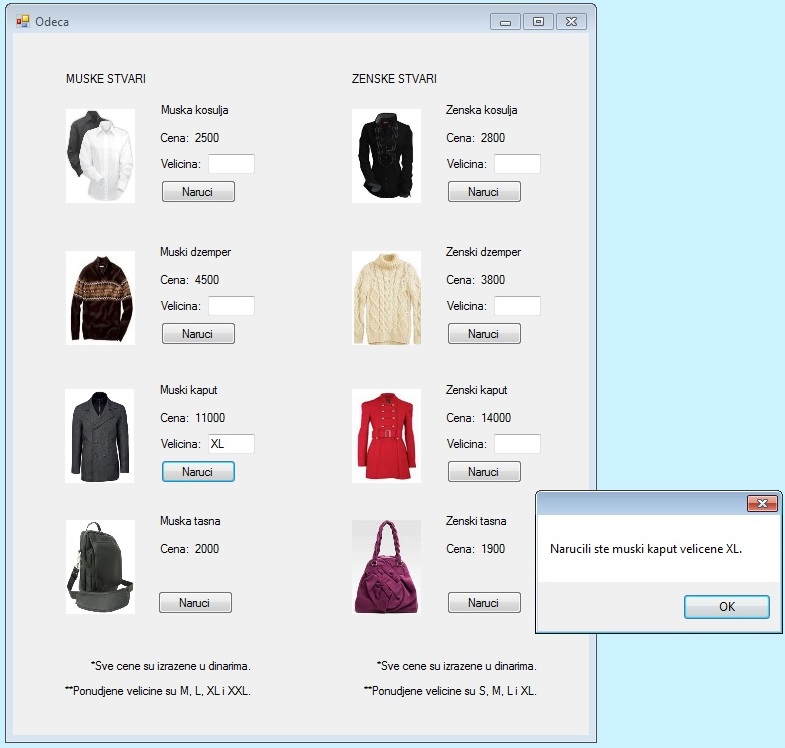 Пример 9. Написати програм који приказује неколико слика мушке и женске гардеробе, а поред сваке слике се налазе подаци везани за ту слику (назив артикла и цена). Такође се поред сваке слике налази поље у које се уноси величина артикла и дугме Naruci. Кликом на дугме Naruci се у MessageBox-у исписује порука шта је наручено и која је величина наручена.