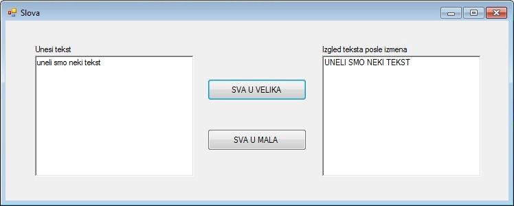 Пример 6. Написати програм који кликом на дугме SVA U VELIKA претвара сва слова текста исписаног у richTextBox1 у велика и исписује их у richTextBox2, а кликом на дугме SVA U MALA претвара сва слова у мала и исписује их у richTextBox2 (у првом RichTextBox-у остаје оригиналан текст, а у другом се исписује у измењеном облику).