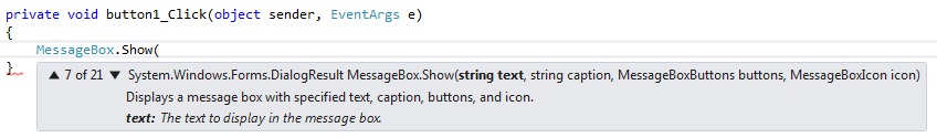 После овог се ставља тачка и опет ће се појавити листа са понуђеним методама (Слика 3.2). Ми ћемо изабрати Show методу. Ова метода може да има више аргумената у заградама, или само један, тако да сада отворимо заграду и појавиће се уоквирено објашњење које описује који то све аргументи могу бити и како се они пишу. На почетку се налазе мале стрелице на које када се кликне приказују се различити аргументи MessageBox-а (Слика 3.3).