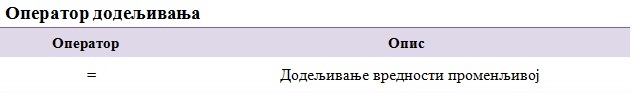 Оператор додељивања. Оператор додељивања поставља вредност променљиве.
