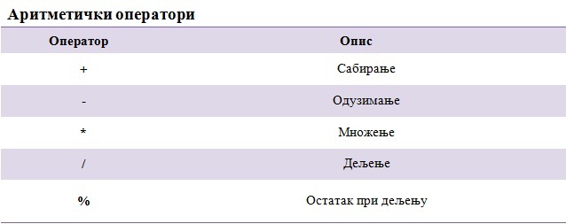 Аритметички оператори. Аритметички оператори извршавају аритметичке операције. Постоји пет аритметичких оператора ( видети табелу која следи ).