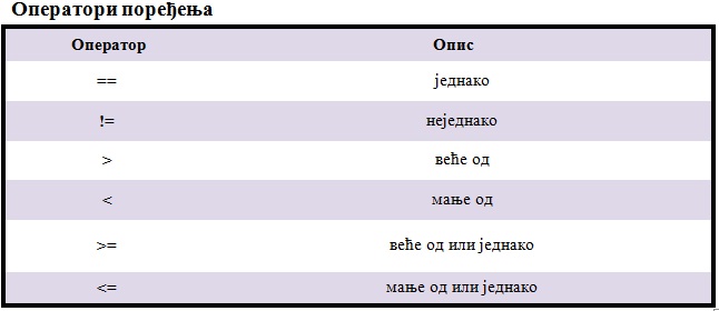 Напомена: Водите рачуна о разлици између оператора ( == ), који пореди две вредности и оператора доделе ( = )који врши додељивање вредности.
