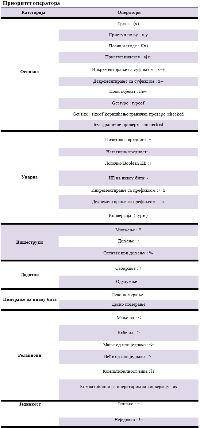 У C# има велики број оператора и ови оператори се могу груписати у категорије које имају исти приоритет.