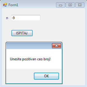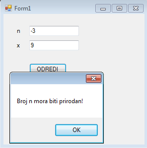 | Слика 8.21. Изглед форме у Примеру 2 ако је унос исправан (Тако да уколико смо унели нпр. n=7 и x=-4 наш програм треба да изгледа овако) | Слика 8.22. Изглед форме у Примеру 2 ако унос није исправан (Уколико смо унели неку погрешну вредност, нпр. n=-3 и x=9 наш програм треба да изгледа овако) |