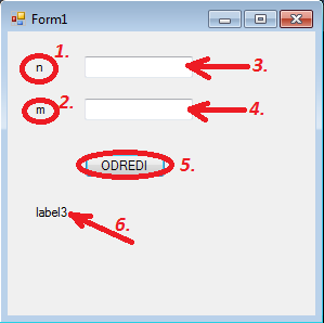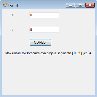 Пример 4. Написати програм који притиском на командно дугме ODREDI одеђује и исписује збир квадрата свих бројева између бројева m и n које корисник унесе. Бројеви m и n су природни бројеви за које важи 1< n < m < 20.