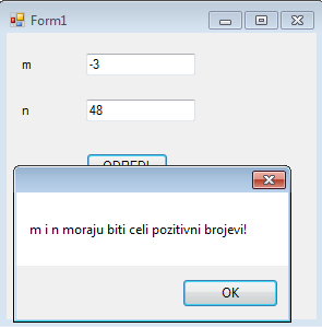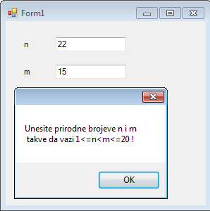| Слика 8.27. Изглед форме у Примеру 4 ако је унос исправан (Тако да уколико смо унели нпр. n=3 и m=15 наш програм треба да изгледа овако) | Слика 8.28. Изглед форме у Примеру 4 ако унос није исправан (Уколико смо унели неку погрешну вредност, нпр. n=22 и m=15 наш програм треба да изгледа овако) |