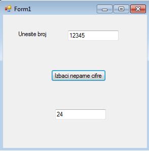 | Слика 8.24. Изглед форме у Примеру 3 ако је унос исправан (Тако да уколико смо унели нпр. n=12 наш програм треба да изгледа овако) | Слика 8.25. Изглед форме у Примеру 3 ако унос није исправан (Уколико смо унели неку погрешну вредност, нпр. n=22 наш програм треба да изгледа овако) |