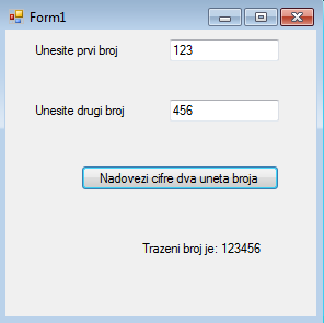 Пример 15. Написати програм којим се надовезују цифре два унета цела броја..
