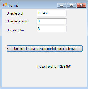 Пример 16. Написати програм који умеће унету цифру на унету позицију унетог целог броја.