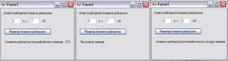 Пример 6. Написати програм који за унете коефицијенте линеарне једначине враћа њено решење.