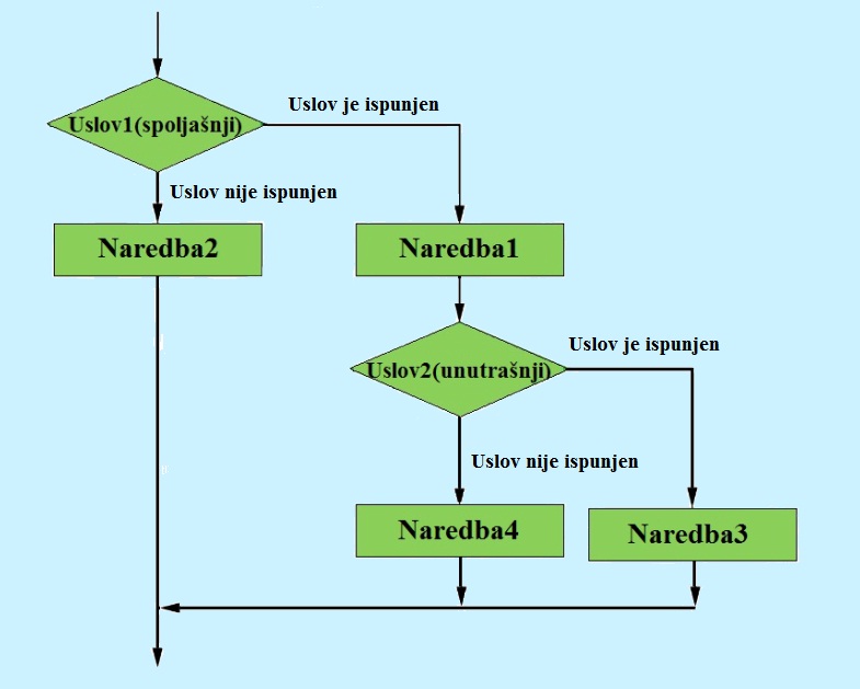 Ако је услов uslov1 true, извршава се блок naredba1. Ако је услов uslov2 true, онда се извршава блок naredbe2. Ако су и услов uslov1 и услов uslov2 false, онда се извршава блок naredbe3. |