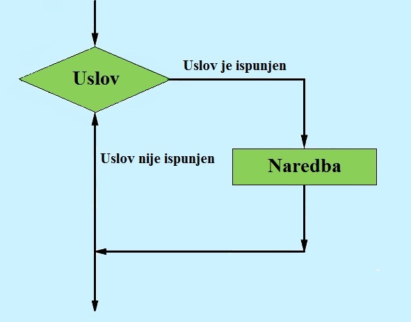 | Ако је испуњен логички израз Uslov (вредност израза је true) тада се извршава наредба Naredba и прелази се на следећу наредбу, а ако услов није испуњен (резултат израза је false) тада се наредба Naredba прескаче и одмах се прелази на следећу наредбу. | Слика 6.1. Дијаграм једносмерног тестирања |