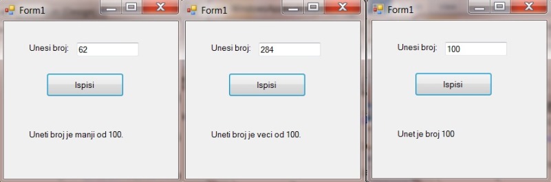 Пример 3. Написати програм који за унети број исписује да ли је он већи, мањи или једнак 100.