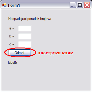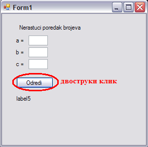 label5.Text = "Neopadajuci poredak brojeva je :" + a + ", " + b + ", " + c;