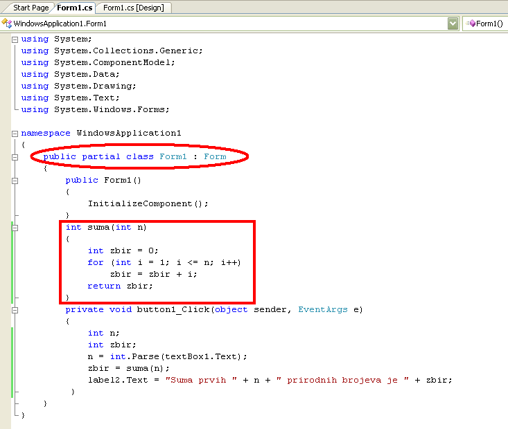 Код функције која ће се касније позивати у програму пишемо било где унутар класе Form1, али независно од других функција које се налазе у Form1. Form1 је класа која дефинише нашу форму и на којој описујемо акције везане за форму. На овај начин везујемо функцију за већ постојећу класу. На следећој слици је приказано где пишемо код наше функције.