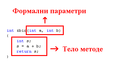 У претходом поглављу смо се упознали са деловима методе функције. Тада смо поменули аргументе које функција користи. Ти аргументи називају се формални параметри. Они се наводе у заглављу, иза имена функције, унутар заграда. Тело методе се састоји од сложених наредби које се налазе унутар витичастих заграда. Унутар тела методе се налазе локалне променљиве и наредбе.