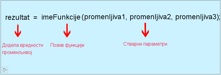 Као што је познато, формални параметри су аргументи које пишемо у заградама иза имена функције. Међутим, формални параметри немају конкретну вредност, они нам само указују на то ког типа треба да буду вредности које ће се налазити унутар заграда приликом позива функције, као и колико ће аргумената функција имати. Позивање методе пишемо у следећој форми: