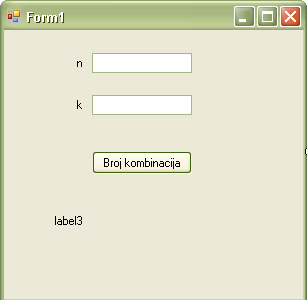 Двокликом на дугме Broj kombinacija отвара нам се прозор у коме пишемо код за наш програм. Унутар класе Form1 пишемо код за функцију факторијел, а унутар button1_Click пишемо код програма у коме ћемо више пута позивати функцију факторијел. | ||