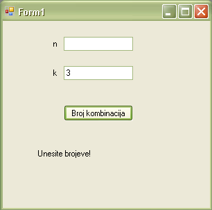 Покренимо сада програм да видимо резултате. Уколико изоставимо попуњавање једног или два поља, као резултат добијамо поруку на слици 9.6, а уколико унесемо неодговарајуће вредности за бројеве n и k, резултат ће бити порука на слици 9.7.![]() |