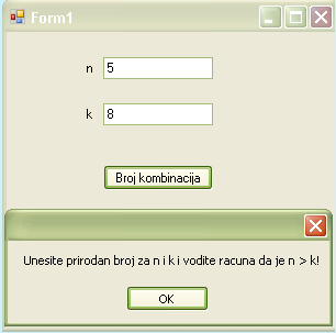 MessageBox.Show("Unesite prirodan broj za n i k i vodite racuna da je n > k!");