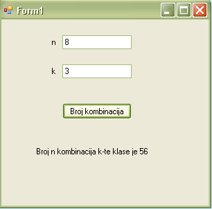 label3.Text = "Broj n kombinacija k-te klase je " + komb;