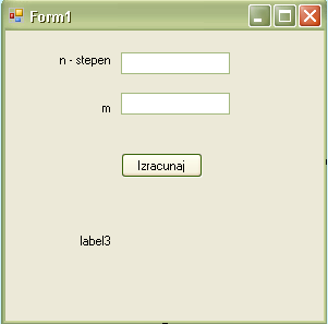 Двокликом на дугме Izracunaj отвара нам се прозор у коме пишемо код за наш програм. Унутар класе Form1 пишемо код за функцију степен, а унутар button1_Click пишемо код програма у коме ћемо позивати функцију степен. Како експонент може бити негативан, решења ће бити реални бројеви. | ||