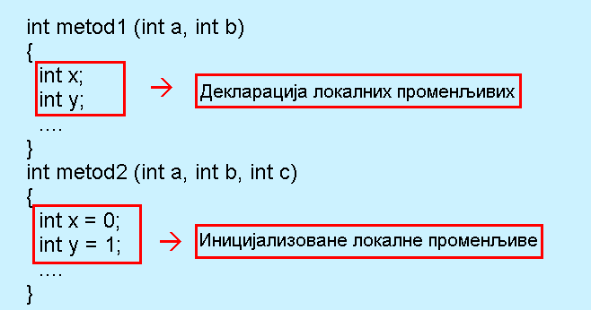 Променљиве декларисане унутар једног метода су локалне променљиве и не могу се видети и користити у телу неког другог метода. Свака метода има свој скуп локалних променљивих. Променљиве декларисане унутар једне методе потпуно су независне од променљивих које су декларисане унутар других метода, чак иако имају иста имена.