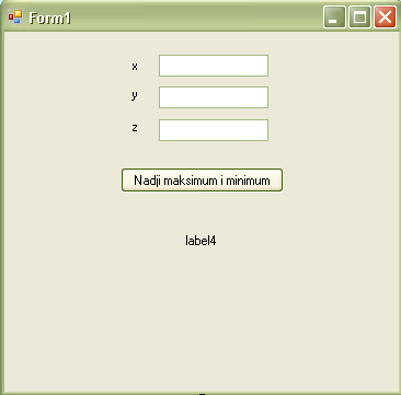 Двокликом на дугме Nadji maksimum i minimum отвара нам се прозор у коме пишемо код за наш програм. Унутар класе Form1 пишемо код за функције које рачунају максимум и минимум, а унутар button1_Click пишемо код програма у коме ћемо позивати наше функције. | ||