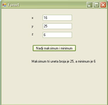 label4.Text = "Maksimum tri uneta broja je " + max + ", a minimum je " + min;