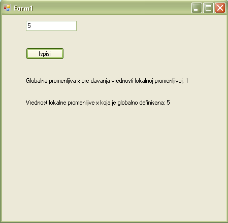 Овде ћемо имати две променљиве истог имена - једну глобалну и једну локалну. Глобалну променљиву ћемо иницијализовати и њена вредност ће бити једнака 1. Локалној променљивој доделићемо вредност из textBox1.