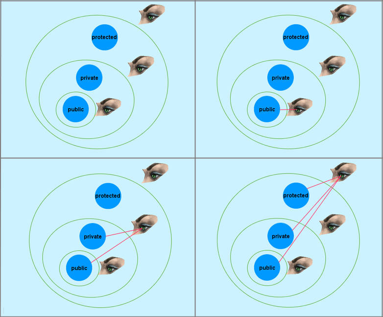 | Напомена: Тамо где је видљива променљива са ознаком protected, ту су видљиве и променљиве са ознакама private и public. Тамо где је видљива променљива са ознаком private, ту је видљива и променљива са ознаком public. Променљива са ознаком public је увек видљива, али ако њу можемо видети, то не значи да ћемо видети и променљиве које су означене са private и protected. | ![]() |