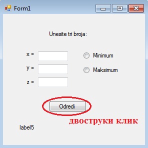 Пример 4. Написати програм који за унета три броја браћа њихов максимум или минимум, у зависности од тога шта желимо наћи, при чему се за то опредељујемо помоћу два radioButton-а.