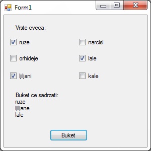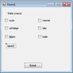 Направимо програм у којем ћемо имати шест CheckBox-ова, две лабеле и једно дугме, који ће нам пружити могућност да бирамо од којих врста цвећа ће се састојати букет који желимо да поклонимо драгој особи.