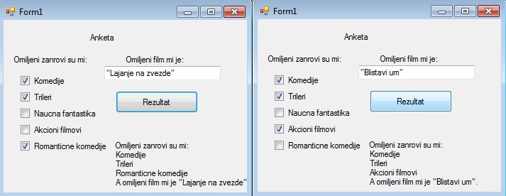 Пример 4. Написати програм који садржи пет checkBox-ова, један textBox и четири labele-е. Преко checkBox-ова бирамо жанрове филмова које волимо да гледамо, а у textBox уносимо омиљени филм. У одређену labele-у нам се исписује резултат свега сто смо одабрали.