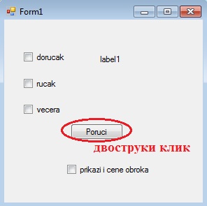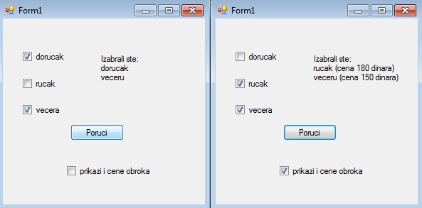 Пример 3. Написати програм који садржи четири checkBox-а, једно дугме и једну лабелу. Преко три checkBox-а се поредељујемо шта желимо да наручимо (доручак/ручак/вечеру), а преко четвртог имамо могућност и да изаберемо да нам буду приказане цене оброка. У лабели нам се исписује шта смо поручили.