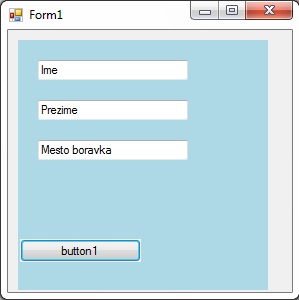 Пример 1. Направићемо форму са дугметом, на којој ће се при клику на дугме појављивати панел са три TextBox-a: име, презиме и место боравка.