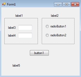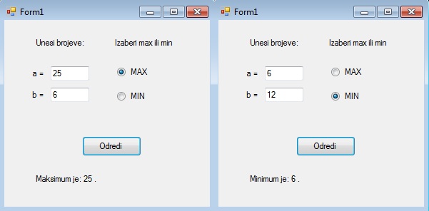 Пример 3. Направимо програм у којем ћемо имати два textBox-а, пет лабела, два radioButton-а, два panel-а и једно дугме. Програм треба да за унете бројеве рачуна максимум или минимум, при чему ће то одабрати на одређеном radioButton-у.