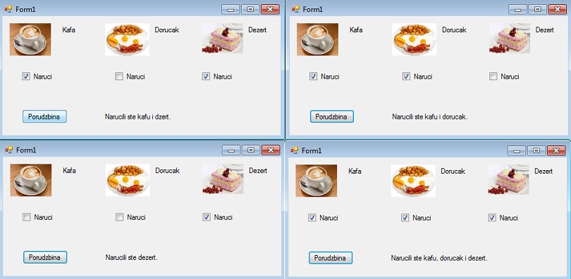 Пример 4. Направити програм који садржи три panel-a на којима су три checkBox-а, три pictureBox-а , и кликом на сваки од checkBox-ова бирамо шта желимо да поручимо.