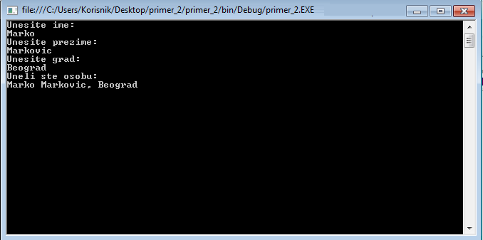 Када покренемо апликацију помоћу тастера F5 отвара нам се прозор у коме пише Unesite ime: . Унесемо неко име (нпр. Марко) и притиснимо Enter на тастатури, након тога се појављује следећа линија у којој пише Unesite prezime: и унесемо презиме особе (нпр. Марковић).Када притиснемо поново Enter појавиће се линија Unesite grad: (нпр. Београд) и на крају када притиснемо Enter исписаће се Uneli ste osobu: и у следећој линије појавиће нам се име и презиме унете особе и град у којем живи(у нашем примеру Марко Марковић, Београд).