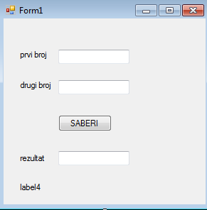 Када наша форма има изглед као на слици 5.14 идемо двоструки клик на дугме SABERI и када нам се отвори нови прозор у телу функције button1_Click куцамо код који треба да се извршава када кликнемо на то дугме.
