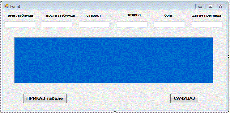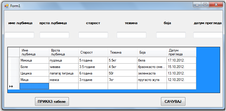 сачувај – пошто смо унели податке о љубимцу у текстуална поља, кликом на ово дугме они се сачувају у одговарајућим пољима табеле