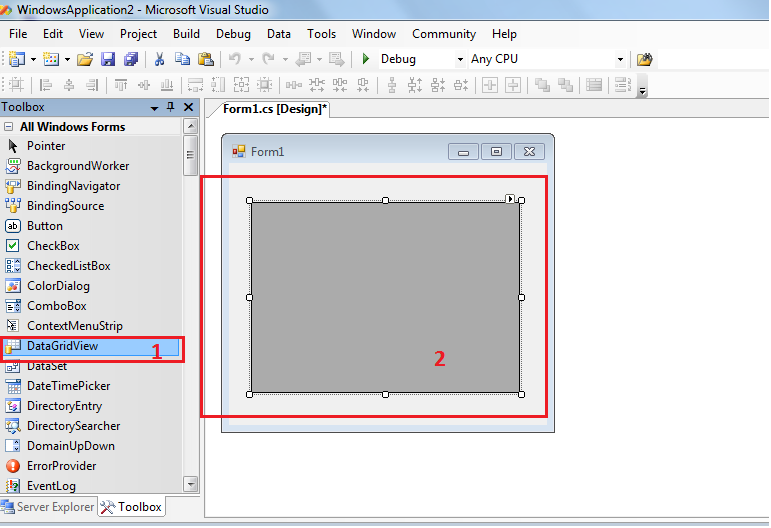 Отворимо нови пројекат, где нам се појави visual окружење, након што смо задали име пројекта. Двоструким кликом или превлачењем додамо DataGridView компоненту на Form-у.