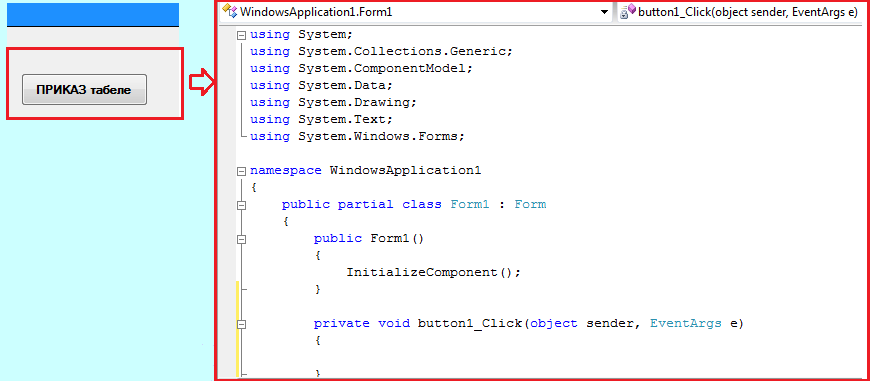 Form1.cs, где пишемо код, који ће покретањем програма
