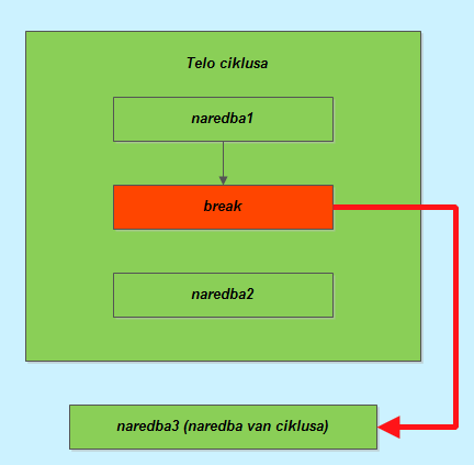 Наредба break моментално прекида петљу. Текућа итерација се прекида, а наредне итерације се не извршавају. Програм наставља да извршава наредбе које следе након петље. |