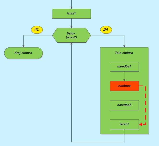 Ове две наредбе можемо представити и блок дијаграмима. Блок дијаграм за наредбу break исти је у свим петљама (Слика 8.13), док се блок дијаграм за наребу continue разликује у зависности од тога унутар које петље се налази. Тако можемо видети како изгледа блок дијаграм за наредбу continue у for петљи (Слика 8.14), као и како изгледа када се налази унутар while (Слика 8.15) или do while петље (Слика 8.16).