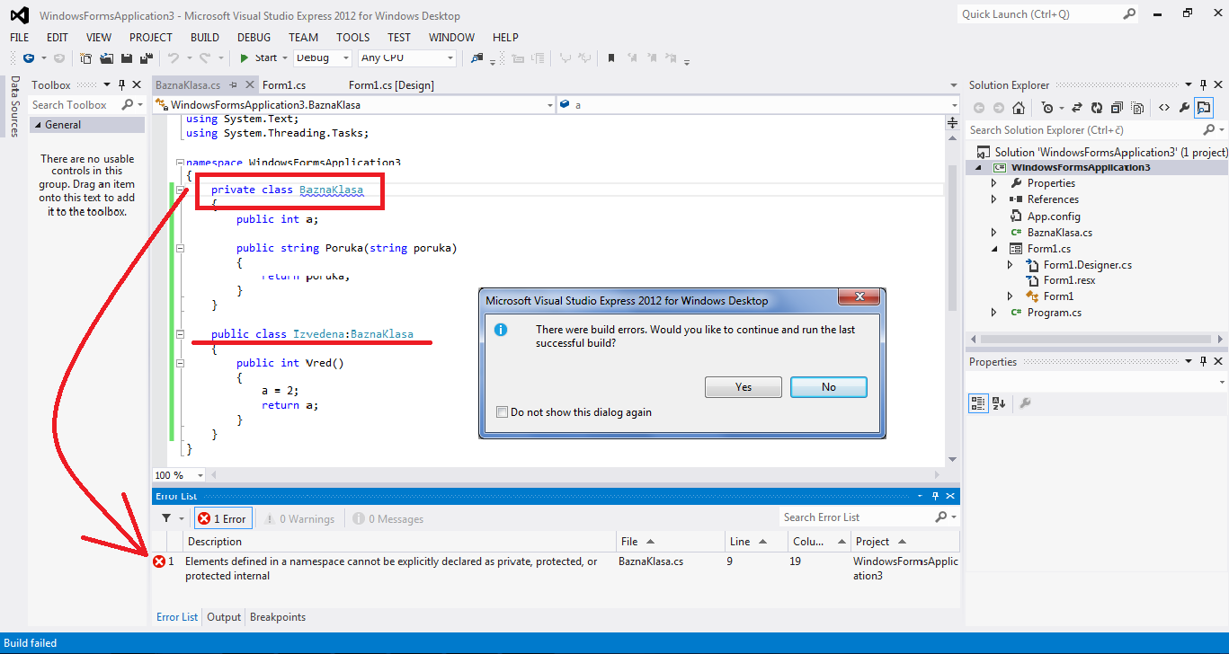 Пример 2. Показаћемо које променљиве, у зависности од своје дефиниције, се могу користити у наслеђеној класи Izvedena, класе Form1.