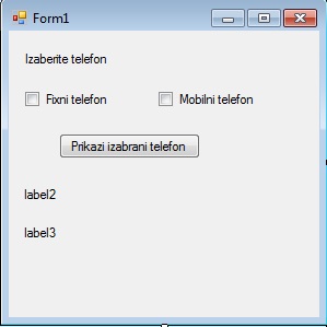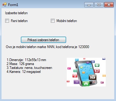 | Када чекирамо једно од понуђених поља "Fixni telefon" или "Mobilni telefon", кликом на дугме "Prikazi izabrani telefon" у label2 и label3 се исписују одговарајуће поруке, док се у pictureBox1 појављује одговарајућа слика. | ![]() |