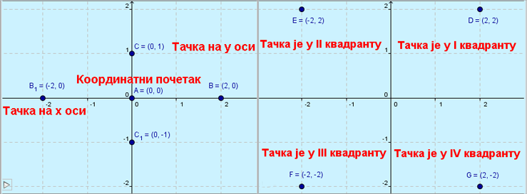 Посебно ако унесемо (0,0) имамо координатни почетак тачка А. Ако нам је координата у=0 а х различито од 0, тачка нам се налази на х оси као тачке В и В1 у зависности да ли је х веће или мање од 0. Или ако нам је координата x=0 а у различито од 0, тачка нам се налази на у оси као тачке С и С1 у зависности да ли је у веће или мање од 0. За х и у веће од 0, тачка се налази у првом квадранту као тачка D. За х мање од 0 и у веће од 0, тачка се налази у другом квадранту као тачка Е. За х и у мање од 0, тачка се налази у трећем квадранту као тачка F. За х веће од 0 и у мање од 0, тачка се налази у четвртом квадранту као тачка G. |